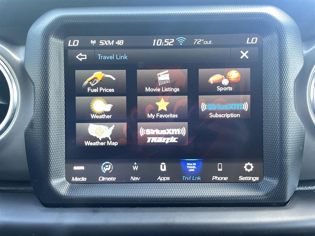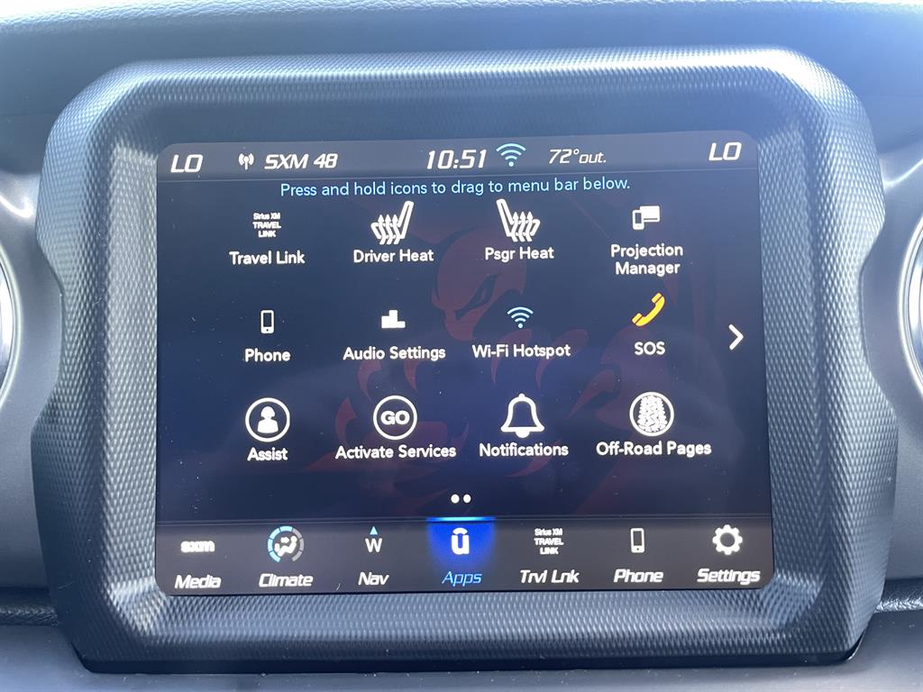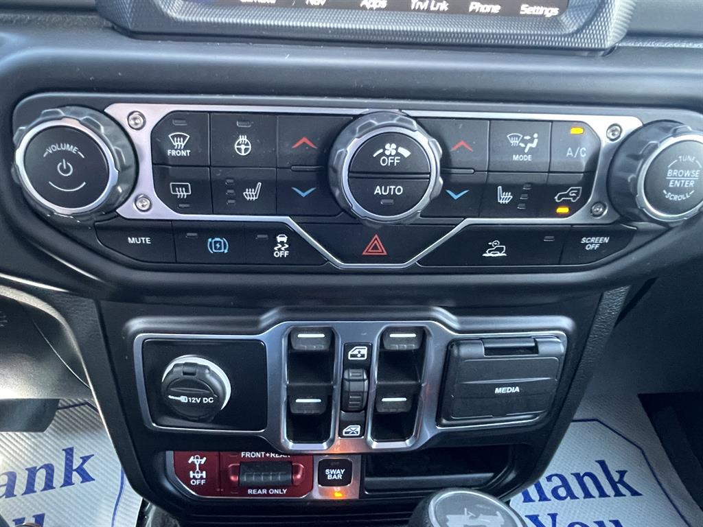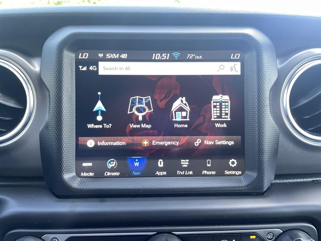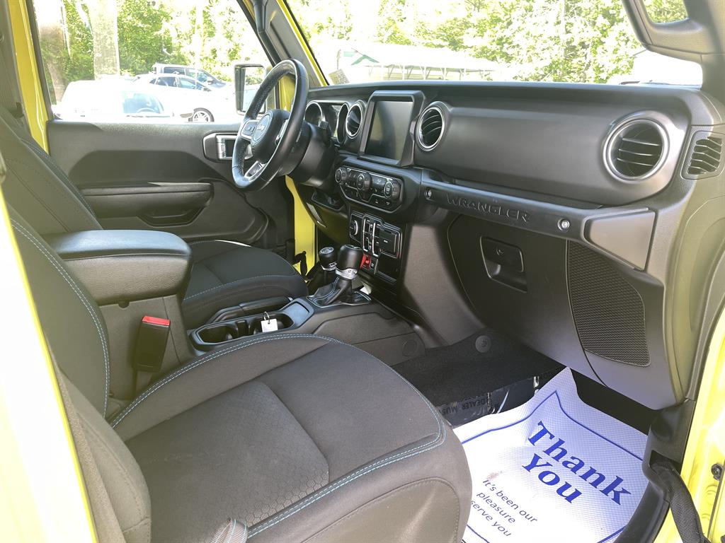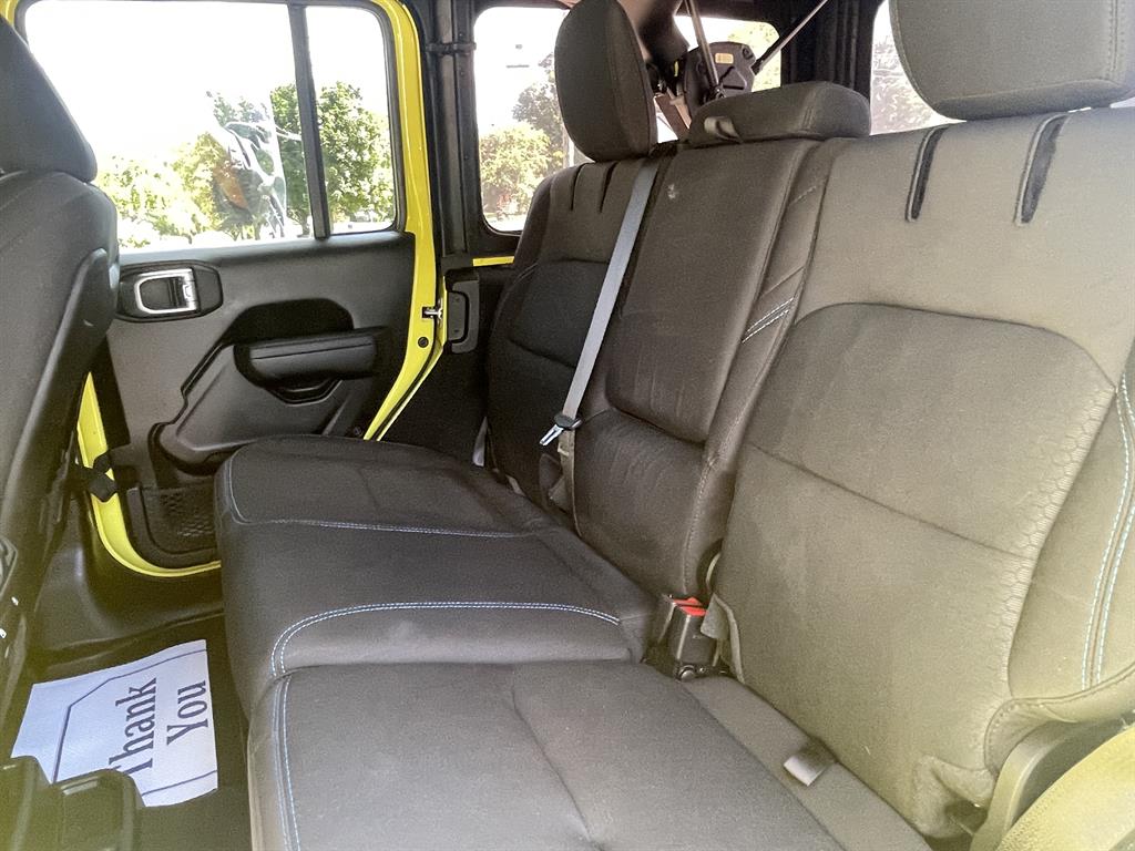 Cold Weather GroupQuick Order Package 29VRemote Start SystemAirbags - Front - DualAir Conditioning - Front - Single ZoneAirbags - Passenger - Occupant Sensing DeactivationAirbags - Front - SideAir Conditioning - Front - Automatic Climate ControlAir Conditioning - Air FiltrationAudio Streaming: BluetoothAudio - Antenna: MastAudio - Antenna: DiversityPower BrakesAudio Voice RecognitionAudio - Premium Brand: AlpineAudio Auxiliary Input: USBAudio Auxiliary Input: JackAudio Auxiliary Input: IPod/IPhone IntegrationAudio - Radio Data SystemAudio - Radio: AM/FMAudio - Radio: HD RadioAudio - Radio: Touch Screen DisplayReading Lights RearFloor Material CarpetFloor Mats FrontFront Brakes Ventilated DiscAssist Handle FrontRear Brakes Ventilated DiscRegenerative Braking SystemBraking AssistFloor Material Cargo Area CarpetAudio - Speed Sensitive Volume ControlAudio System 8 SpeakersFloor Mat Material CarpetParking Brake Trim UrethaneCargo Area LightChild Seat Anchors LATCH SystemRear Floor MatsReading Lights FrontChild Safety LocksAudio System 1 SubwooferAudio - SiriusXM Satellite RadioBraking assist hill start assistABS Brakes (4-Wheel)Electronic Brakeforce DistributionAudio System 552 WattsCruise ControlPower Steering Speed-ProportionalDoors Rear Door Type: Side-HingedCenter Console Front Console With Armrest And StorageMulti-function Remote Keyless Entry With Panic AlarmWindows Tinted WindshieldEngine Auto Stop/StartStorage BinDrivetrain Drive Mode SelectorSteering Wheel Mounted Controls Cruise ControlsUniversal Garage Door Opener HomelinkCenter Console With LightingSteering Wheel Mounted Controls PhoneRear View CameraSteering Wheel Mounted Controls AudioAdjustable Rear Headrests FoldableEngine Electric Charge Cord: 240 VoltStorage Door PocketsGrille Color Body-ColorDrivetrain Oil Cooler: AuxiliaryStorage Cargo Tie-Down Anchors And HooksEngine Push-Button StartRear View Monitor In DashFender Lip Moldings BlackEngine Electric Motor Battery Type: Lithium IonDrivetrain Transfer Case: Manual Hi-Lo Gear SelectionFront 12V Power Outlet(s)Front 115V Power OutletDriver Seat Manual Adjustments: ReclineCargo Area 12V Power OutletEngine 50 State EmissionsDriver Seat Manual Adjustments: 6Drivetrain Locking Differential: FrontMulti-function Remote Proximity Entry SystemSteering Wheel Tilt And TelescopicDriver Seat Adjustable Lumbar Support: ManualEngine Battery SaverDrivetrain Locking Differential: RearCenter Console LockingSteering Wheel Mounted Controls Multi-Function Screen ControlsStorage Front SeatbackSteering Wheel Mounted Controls Voice Recognition ControlsTool KitTrip OdometerWindows Solar-Tinted GlassExternal Temperature DisplayNumber Of Rear Headrests 3Fuel Economy Display RangeCompassRear Bumper Color BlackWarnings And Reminders Low Fuel LevelRemovable Roof Soft TopPassenger Seat Manual Adjustments: 4Phone Voice ActivatedFuel Economy Display MPGSeats Premium Cloth UpholsteryHeadlights Auto Delay OffRear Seats Split FoldingSkid Plate(s) FrontSeatbelts Seatbelt Force Limiters: FrontExterior Mirrors PowerHeadlights Auto On/OffTraction Control With Trailer Stability AssistMirror Color BlackDoor Courtesy LightsSecurity Engine ImmobilizerSeatbelts Seatbelt Warning Sensor: Driver And PassengerNavigation System Touch Screen DisplayStability ControlFront Seatbelts: 3-PointDaytime Running Lights LEDElectronic Messaging Assistance With Read FunctionSpare Wheel Aluminum Alloy Rim TypeVanity Mirrors Dual IlluminatingFront Suspension Type: Multi-LinkRocker Panel Color Body-ColorTraction ControlSeatbelts Second Row 3-PointSpare Tire Outside Mount LocationSkid Plate(s) Front And RearAmbient LightingPassenger Seat Manual Adjustments: ReclineSpare Tire Fullsize Matching SizeNavigation System Hard DrivePower Door Locks Anti-Lockout FeatureOne-Touch Windows: 2Exterior Entry Lights Security Approach LampsInside Rearview Mirror Auto-DimmingClockRear Seats 60-40 Split BenchOff-Road Suspension PackageSecurity Anti-Theft Alarm SystemMulti-Function DisplayDigital OdometerSeatbelts Emergency Locking Retractors: FrontExterior Mirrors Manual FoldingWindow Trim BlackNumber Of Front Headrests 2Phone Wireless Data Link BluetoothCrumple Zones FrontElectronic Messaging Assistance With Voice RecognitionTachometerCrumple Zones RearWarnings And Reminders Low BatterySeatbelts Seatbelt Pretensioners: FrontAuto-LockRoll Stability ControlFootwell LightsFront Suspension Classification: Solid Live AxleHeadlights LEDNavigation System With Voice RecognitionInterior Chrome AccentsSeats Front Seat Type: BucketTail And Brake Lights LEDFront Headrests AdjustableExterior Mirrors HeatedTowing And Hauling Tow Hooks: FrontTowing And Hauling Tow Hooks: RearReal Time TrafficSuspension Rear Coil SpringsSuspension Front Spring Type: Coil SpringsWindows Privacy GlassPower Windows: With Safety ReverseWindows Front Wipers: Variable IntermittentSuspension Stabilizer Bar(s): RearWindows Lockout ButtonSatellite Communications UconnectPremium Cloth Low-Back Bucket SeatsVehicle Assistance App - Roadside AssistanceWifi CapableDrivetrain 4WD Type: Part Time with On Demand SettingLinked Or Integrated Apps - Information And Entertainment: Google POIsInfotainment With Apple Carplay ReadyLinked Or Integrated Apps - Vehicle Utility: Parked Car FinderInfotainment With Android Auto ReadyLinked or Integrated Apps - Information and Entertainment: Google SearchLinked or Integrated Apps - Information and Entertainment: SiriusXM Travel LinkLinked Or Integrated Apps - Security: Remote Locking Horns And LightLinked Or Integrated Apps - Security: Remote LockingSeats - Driver Seat Manual Adjustments: HeightPremium Black Sunrider Soft TopLT285/70R17C OWL Off-Road TiresMOPAR All-Weather Floor MatsSuspension Front stabilizer bar: electronic disconnectingIn Car Entertainment Infotainment screen size: 8.4 in.Smart device app compatibility SiriusXM Guardian